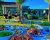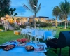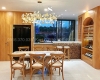 Không gian ngoài trời nổi bật với hồ bơi riêng lớn, ghế thư giãn, và khu BBQ ngoài trời gồm bàn tiệc, khăn trải bàn trắng và bếp nướng than hoa. Khu bếp trong nhà được trang bị đầy đủ: tủ lạnh đôi, lò vi sóng, nồi chiên – lò nướng, bếp từ, chén đĩa, nồi chảo.