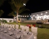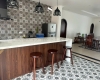 Khu phòng khách, bếp và quầy bar được thiết kế hướng biển hiện đại, tạo không gian mở sang trọng. Ngoài trời là hồ bơi riêng lớn, ghế thư giãn và khu BBQ ngoài trời với bàn tiệc đẹp, khăn trải bàn trắng và bếp nướng than hoa. Khu bếp đầy đủ tiện nghi gồm tủ lạnh đôi, lò vi sóng, nồi chiên – lò nướng, bếp từ, nồi chảo, chén đĩa, ly cốc.